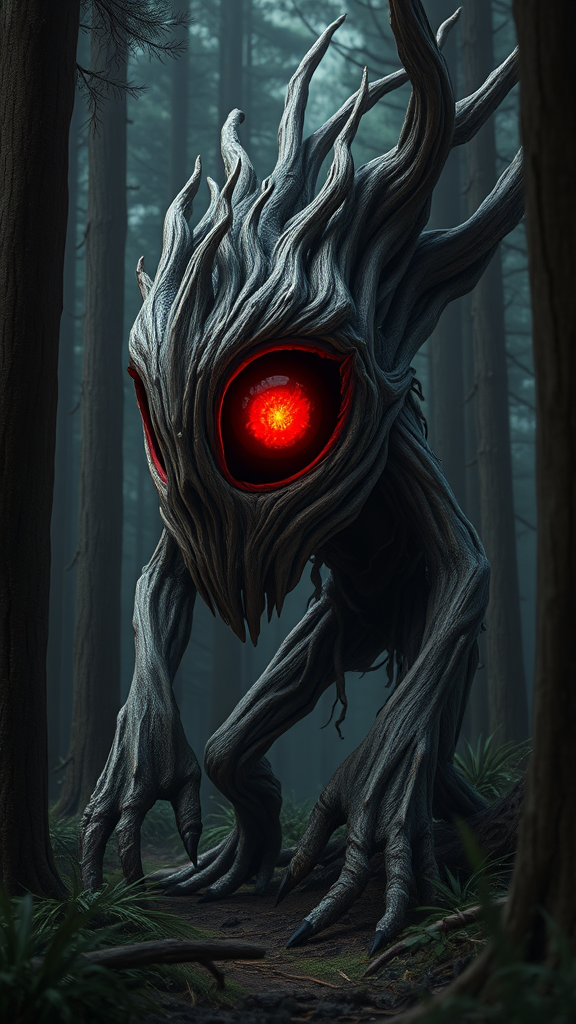 A fearsome wood creature emerges, its singularly large red eye glowing ominously in the dim light of the pine forest. This formidable entity takes inspiration from the enigmatic depths of a mysterious jungle, its form meticulously rendered in hyper-realistic detail reminiscent of work by Filip Hodas and the surreal artistry of Sandy Skoglund. The anatomy of this woodland specter is crafted from twisted, organic elements, its bark-like skin seamlessly blending with the surrounding trees in a tribute to nature's design. Influences of Daz3D technology ensure a highly detailed depiction, capturing the essence of a creature woven from roots and branches. Amidst the eerie ambiance, the creature exudes an anthropological aura, as though it has risen from an ancient storybook filled with myth and mystery. The style echoes frogcore sensibilities, imbuing it with a peculiar yet captivating presence, while close inspection reveals textures reminiscent of a vivid illustrated tale brought to life through the precision of Maya's rendering capabilities.