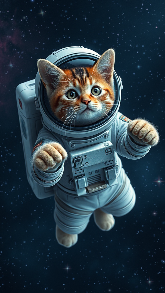 A feline astronaut gracefully drifts through the cosmos in an intricately designed spacesuit, every stitch visible in stunning 8k resolution. The helmet's visor reflects distant galaxies and nebulae, while the suit itself shimmers with subtle hints of iridescent colors, capturing the mystery of space. The cat's eyes, wide and curious, gleam with wonder as it paws gently at floating particles of stardust, creating an enchanting scene of cosmic exploration.