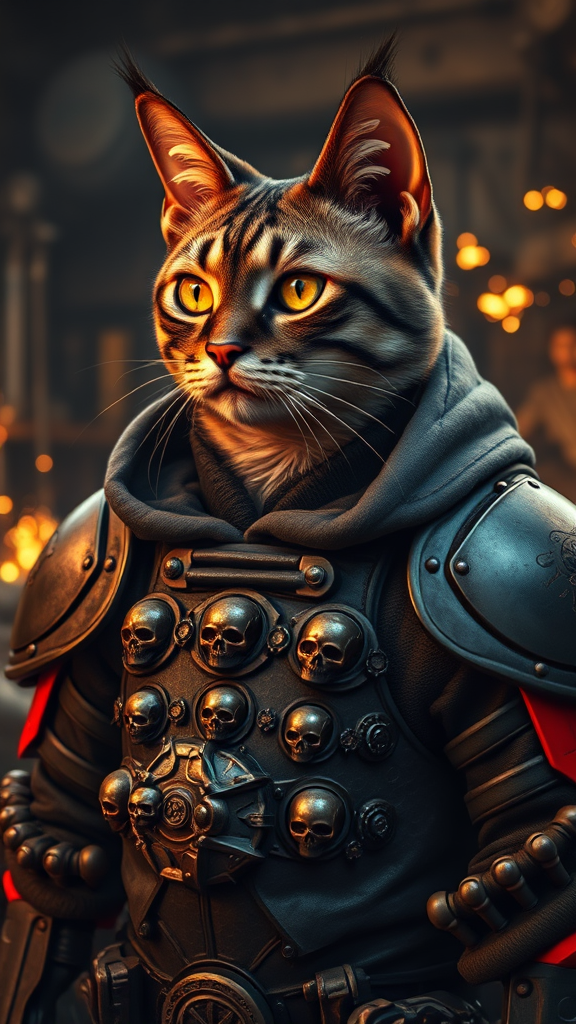 A feline figure clad in a fusion of power armor and hoodie reminiscent of adeptus mechanicus, adorned with intricate eyepieces and finely detailed armor. The armor is encrusted with miniature skull motifs, predominantly black with striking red accents, evoking the darkness of Warhammer 40k. The cat gazes thoughtfully into the distance, set against the backdrop of a busy blacksmith shop. Sparks fly and cinematic lighting bathes the scene in dramatic, hyper-realistic shadows and highlights.