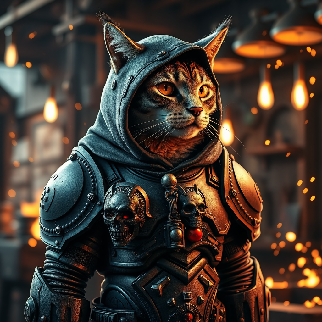A feline figure clad in a power armor-hoodie resembling the Adeptus Mechanicus armor, adorned with intricate designs and eyepieces, stands with an air of authority. The armor is finely detailed, featuring encrusted skulls, predominantly in black and red hues, capturing the grim aesthetic of Warhammer 40k. The cat gazes into the distance, unfazed by the bustling blacksmith shop in the background. Glowing embers and flying sparks illuminate the scene, enhancing the dark tones with a cinematic flair, all rendered in hyper-realistic style.