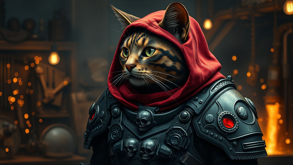 A feline figure clad in intricately detailed power armor-crossed with a hoodie, reminiscent of the adeptus mechanicus aesthetic, glances off into the distance. The armor is adorned with eyepieces and encrusted with ornate skull designs, reflecting the grim elegance of Warhammer 40k. The color palette is a striking blend of black and red, rich in dark tones. Set against the atmospheric backdrop of a bustling blacksmith shop, vibrant sparks fly, casting a dramatic, cinematic glow over the scene. The hyper-realistic portrayal captures the essence of a universe steeped in both mystery and power, with subtle creative elements enhancing the original vision.