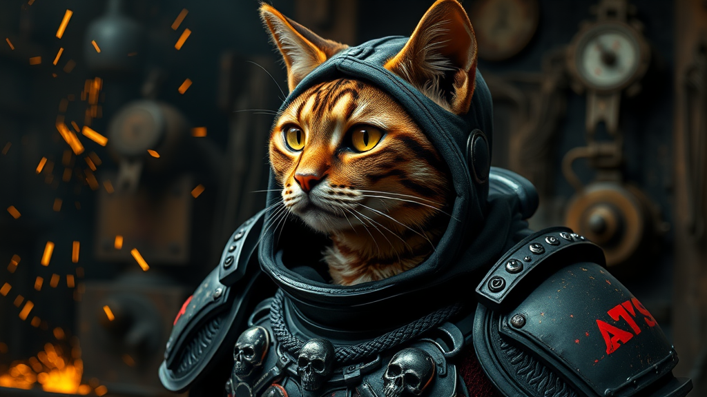 A feline figure donning a power armor-hoodie inspired by adeptus mechanicus, featuring intricate eyepieces and exquisitely detailed armor, gazes into the distance. Its attire is adorned with ornate skull embellishments, predominantly black and red, capturing the essence of the Warhammer 40k universe. Set against the gritty backdrop of a blacksmith shop, the ambiance is alive with flying sparks, accentuated by dramatic, cinematic lighting. The scene is rendered in hyper-realistic detail, with a tangible sense of weight and texture in the armor.