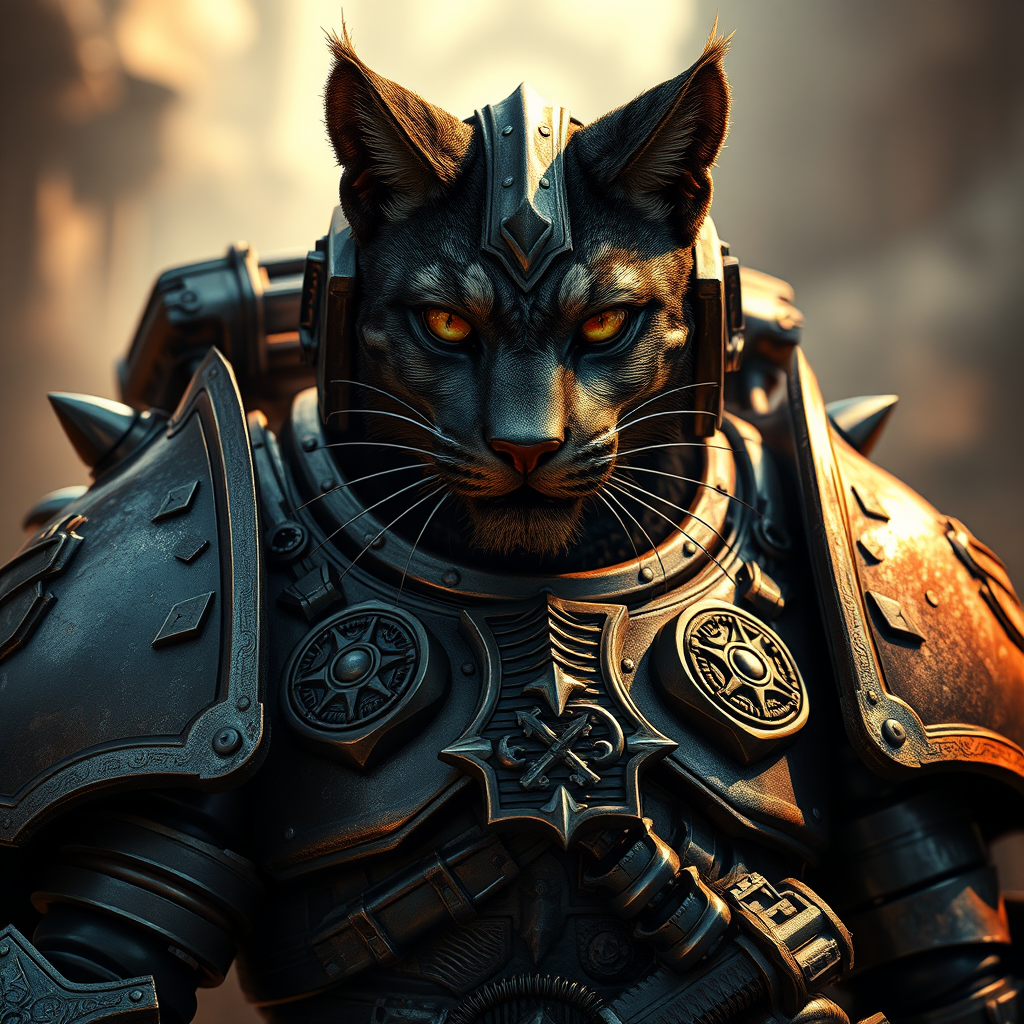A feline warrior clad in intricately detailed power armor of the Adeptus Astartes, embodying the essence of Warhammer 40k. Exuding an aura of dark majesty, its armor showcases ornate engravings and symbols of ancient battles. Under the play of cinematic lighting, the hyper-realistic depiction captures the intense gleam of metal and the piercing gaze of its eyes, evoking a mythic sense of power and mystery.