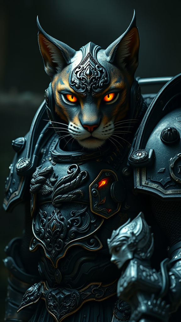 A feline warrior clad in intricately detailed power armor, embodying the essence of Adeptus Astartes from Warhammer 40k, with dark, moody hues and dramatic cinematic lighting, showcasing a hyper-realistic portrayal, the armor featuring ornate designs blending both feline grace and Space Marine strength, with piercing eyes glowing brightly in the shadowy environment.