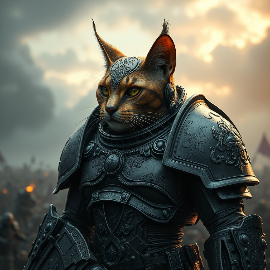 A feline warrior in intricately detailed power armor resembling Adeptus Astartes, featuring elaborate engravings and heraldry, set in the grimdark universe of Warhammer 40k. The armor displays a sleek fusion of feline elegance and martial strength, with dark, moody tones and dramatic cinematic lighting highlighting its hyper-realistic textures and shadows. The setting is a war-torn battlefield, with an ominous sky casting an eerie glow, enhancing the cat's commanding presence.