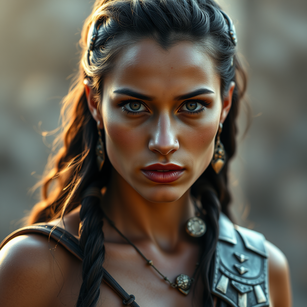 A female Amazon warrior stands confidently, her gaze fixed on the viewer, showcasing her strength. The portrait captures her in a detailed, photo-realistic style with an 8k resolution that highlights her skin's texture. The soft, diffused light bathes her in a cinematic glow, creating a hyper-realistic effect with a shallow depth of field and sharp focus. Her piercing and warrior attire contribute to the realistic photography, appearing like a high-detail RAW color artwork. The composition maintains a full-length frame, focusing on her confident stance. Her presence exudes power and grace, devoid of imperfections or distortions, ensuring every detail contributes to the authentic Amazonian aesthetic.