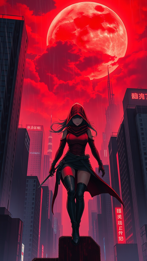 A female assassin ninja clad in a sleek red and black outfit moves stealthily through the night, amidst towering black and red skyscrapers that pierce the dark, foggy sky. A cyberpunk cityscape surrounds her, illuminated by the flickering glow of fluorescent lights casting dynamic and vivid color palettes. Above, a menacing red sky stretches wide, dotted with blood-red clouds that swirl ominously around a colossal red moon. The atmosphere throbs with electric tension, as torrents of rain blur the neon-drenched world around her. This scene, an anime-inspired hybrid of art and action, captures the silent fury and mystique of the solitary warrior navigating a dystopian realm where shadows and light dance in an eternal struggle.