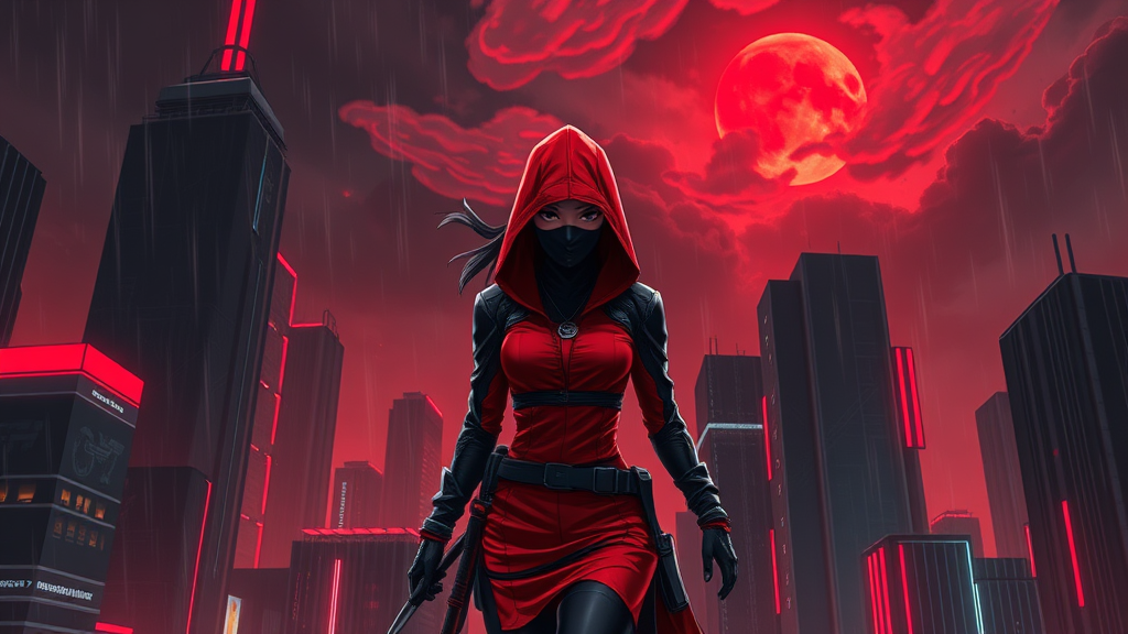 A female assassin ninja clad in a sleek red and black outfit, prowling through a futuristic cityscape under a dark, foggy sky. The city is alive with cyberpunk elements, featuring towering black and red buildings illuminated by fluorescent lights. The dynamic color palettes blend seamlessly with a sky painted in deep reds and ominous weather, where a red moon peers through swirling red clouds. Rain falls gently, enhancing the mood of suspense and danger. This scene, inspired by anime, blends traditional stealth with a high-tech urban environment, crafting a vibrant yet foreboding atmosphere.