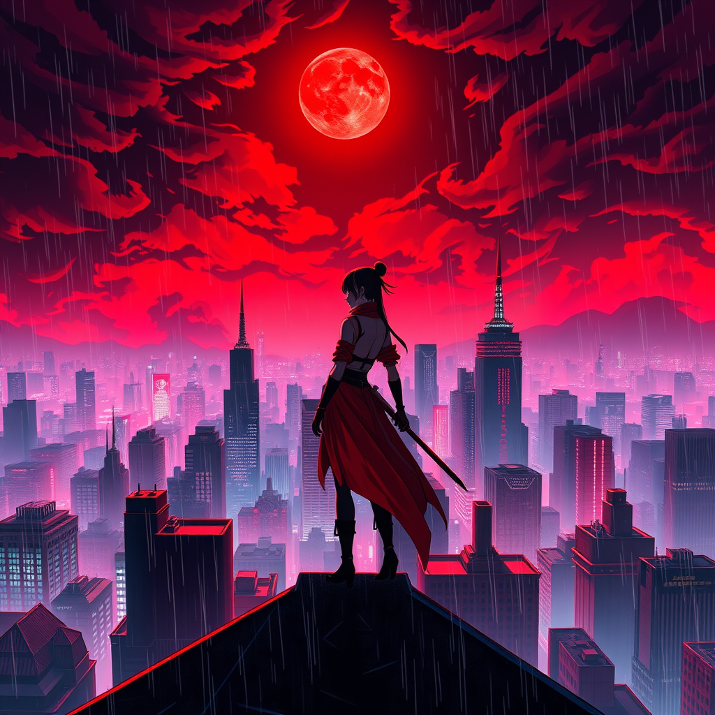 A female assassin ninja in a sleek red and black outfit stands poised on the rooftop of a futuristic cityscape, her silhouette sharp against a night sky dominated by a blood-red moon. The skyline is crowded with black and red architecture, illuminated by flickering neon lights that cast a vibrant, fluorescent glow across the scene. A dark, foggy sky swirls with ominous red clouds, hinting at the brewing storm, as rain begins to fall in a rhythmic dance. The city's cyberpunk essence is palpable, with dynamic color palettes reflecting off rain-slick surfaces, creating an otherworldly atmosphere. Inspired by anime aesthetics, the scene captures the tension and beauty of a world where tradition meets advanced technology, with the lone ninja embodying grace and lethal precision amidst the chaos.