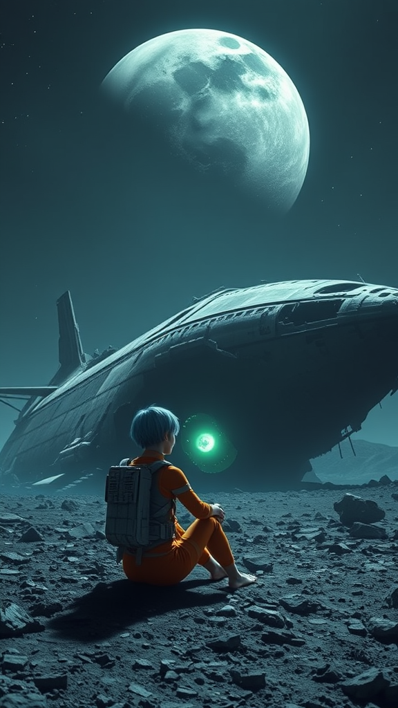A female astronaut with short blue hair sits barefoot, gazing at the sky in front of an enormous, abandoned spaceship that lies wrecked on a barren, rocky planet. Her orange leggings space suit contrasts with the dark and jagged outline of the ship, from which a faint green luminescence seeps, hinting at a lingering energy within. The spaceship is severely damaged, with significant sections of its hull shattered or missing, suggesting a past catastrophe. Above, a massive planet looms in a barely star-speckled dark sky, emphasizing the scene's vastness and isolation. The mood combines mystery and awe with a hint of danger, evoking a sense of forgotten turmoil or immense power. The color scheme is predominantly dark, with deep blues, blacks, and greens, offering detailed textures on both the spaceship and the rocky terrain, with atmospheric perspective providing depth to the somber landscape.
