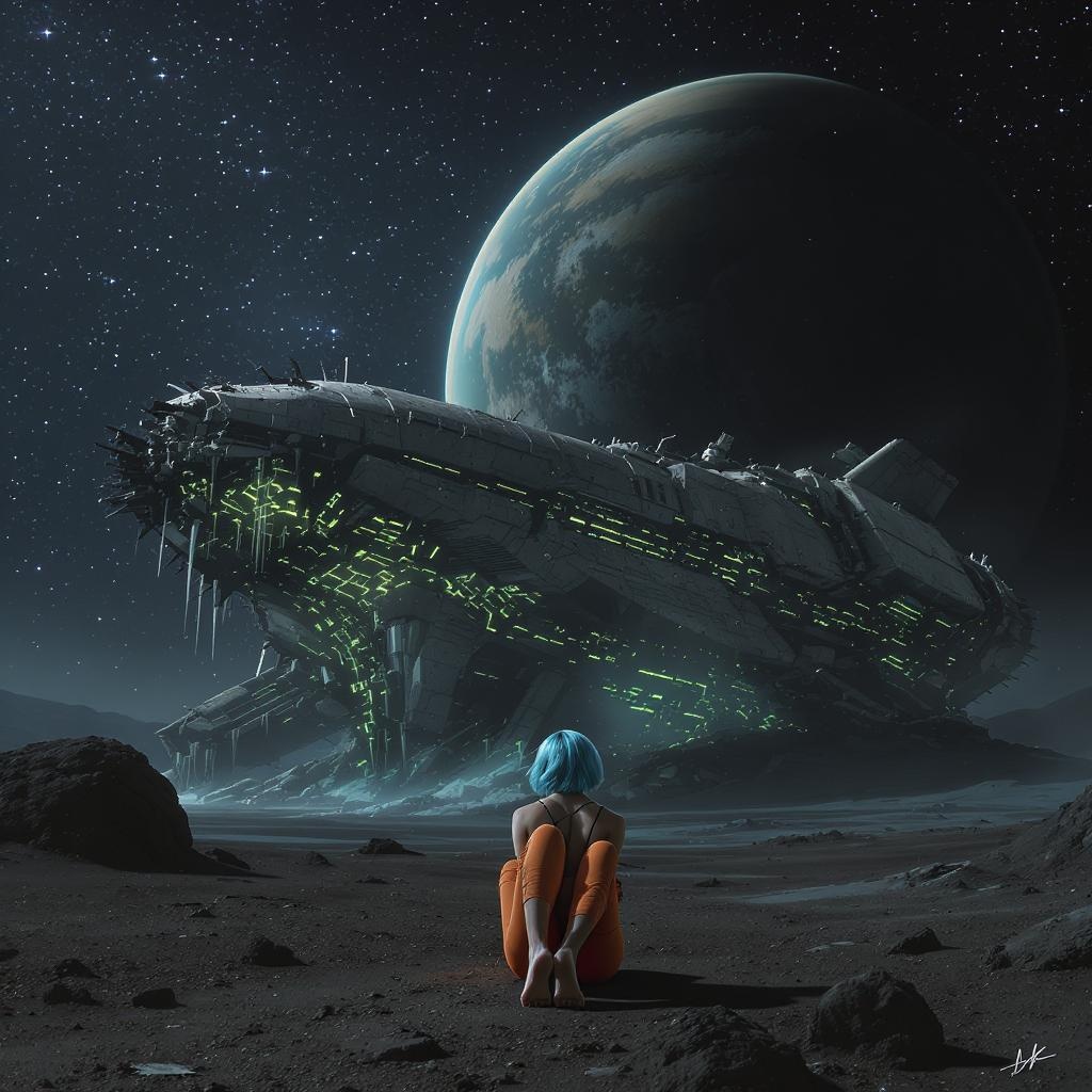 A female astronaut, with striking blue short hair and barefoot, dressed in an orange leggings-style space suit, sits gazing at the cosmos in front of a colossal, forsaken spaceship that has crash-landed on a barren, rocky planet. The spacecraft exhibits a jagged, shadowy exterior, with a subtle luminescence of green energy seeping from its innards. The vessel is battered and scarred, sections of its hull shattered or absent. Overhead, the sky looms dark, sparsely dotted with stars, enhancing the feeling of expansive solitude. The ambiance exudes mystery, awe, and potential peril, hinting at a location with immense power or the aftermath of a forgotten catastrophe. Dominated by a dark color scheme interspersed with greens, blacks, and deep blues, the scene is rich with intricate textures on both the ship and planetary terrain, with atmospheric perspective adding depth. A massive planet hangs in the sky, accentuating the otherworldly vastness.