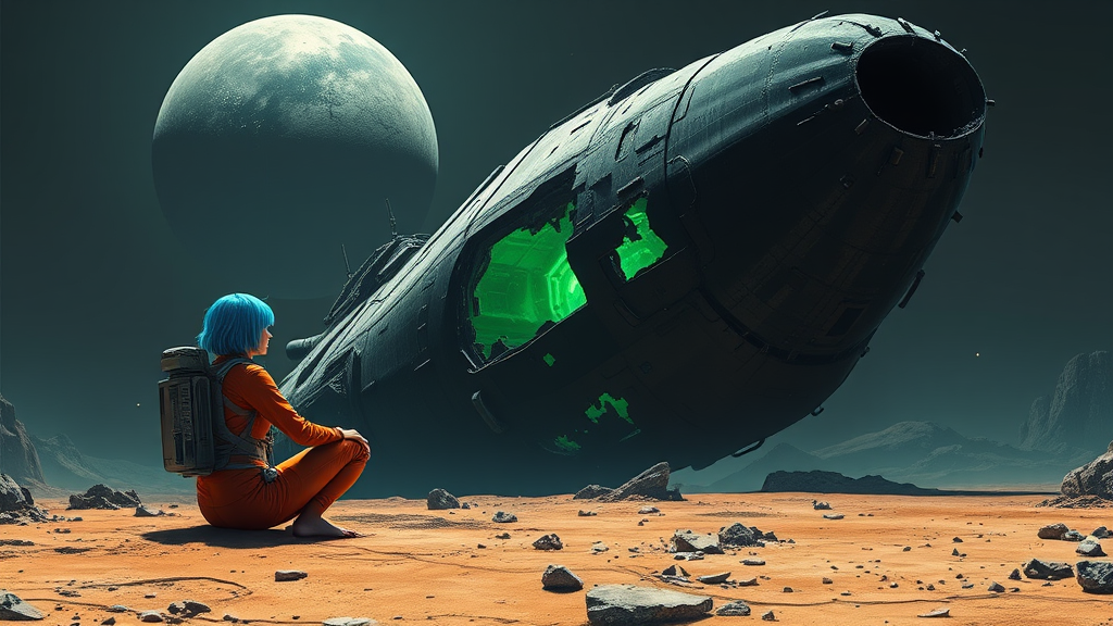 A female astronaut with striking blue short hair sits barefoot, clad in orange leggings that form part of her space suit. She gazes contemplatively at the sky, where a massive, derelict spaceship looms nearby, having crash-landed on a barren, rocky planet. The ship's dark, angular structure is ominously silent, its interior emanating a faint, otherworldly green energy. Damage is extensive, with gaping holes and missing fragments marring its hull, remnants of a once-mighty vessel. A few distant stars punctuate the dark expanse of the sky, heightening the sense of vastness and solitude. The scene resonates with an air of mystery and wonder, shadowed by a hint of danger, suggesting hidden power or a long-buried catastrophe. The palette is dominated by deep greens, blacks, and blues, with intricate textures accentuating the spaceship's scarred surface and the planet's rugged terrain. In the backdrop, a colossal planet hangs in the sky, adding to the atmospheric depth and grandeur of the scene.