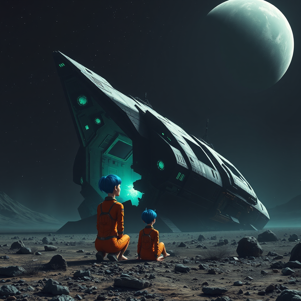 A female astronaut with striking blue short hair, seated barefoot in a sleek orange space suit, gazes thoughtfully at a star-strewn sky. She sits before a colossal, abandoned spacecraft that has crash-landed on a barren, rocky world. Its shadowy, angular form is illuminated by a subtle green energy pulsing from deep within its fragmented and gaping hull. The spacecraft appears to have endured a catastrophic event, with jagged breaches and missing segments. The backdrop is an expansive dark sky, sparsely dotted with stars, enhancing the feeling of endless isolation. The scene exudes an air of mystery, wonder, and potential peril, hinting at secrets of great power or the echoes of a forgotten disaster. The color palette is dominated by deep hues of green, black, and dark blue, with intricate details accentuating the textures of the ship and the desolate terrain. Atmospheric perspective lends depth, and a gigantic planet looms in the distant sky, adding a sense of otherworldly scale.