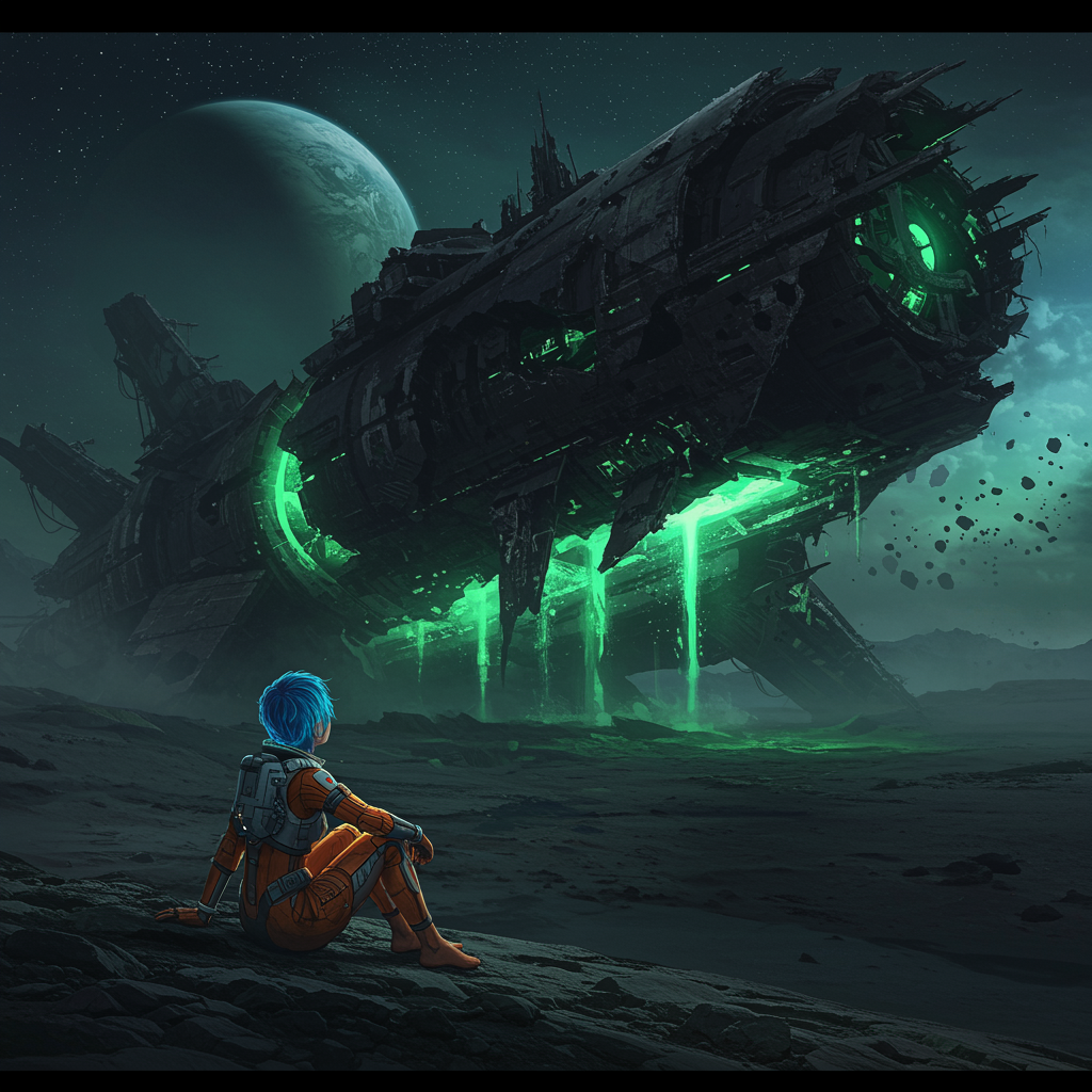 A female astronaut with vibrant blue short hair and wearing orange leggings as part of her space suit sits barefoot, gazing at the sky in front of a colossal, derelict spaceship that lays wrecked on a barren, rocky planet. The structure is dark and angular, with faint green luminescence seeping from within its depths. The vessel is visibly deteriorated, with large sections of its hull shattered or missing altogether. In the backdrop, a dark expanse punctuated by a smattering of distant stars enhances the feeling of vast isolation. The overarching mood is infused with mystery, wonder, and an air of potential danger, hinting at a site of tremendous power or remnants of a forgotten cataclysm. Dominated by a dark color palette with slivers of green, midnight black, and deep blue, the scene offers detailed textures of the spacecraft and the planet's stony terrain, employing atmospheric perspective for depth. A massive planet looms in the sky, adding to the sense of otherworldly grandeur.