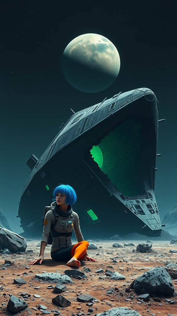 A female astronaut with vibrant blue short hair sits barefoot, wearing striking orange leggings as part of her space suit. She gazes at the expansive sky, surrounded by a massive, abandoned spaceship that has crash-landed on a barren, stony planet. The once-majestic structure is dark and angular, with faint wisps of green energy flickering ominously from its ruptured interior. Its hull bears the scars of a violent descent, with significant sections shattered or missing. Overhead, a dark sky looms, sparsely dotted with stars, enhancing the vastness and desolation of the scene. The mood is steeped in mystery and wonder, hinting at potential danger, suggesting an area imbued with immense power or the remnants of a bygone catastrophic event. The color palette is predominantly dark, featuring shades of green, black, and deep blue, with detailed textures embellishing both the derelict spaceship and the rugged surface of the planet. A colossal planet hovers in the sky, adding to the atmosphere of depth and isolation.