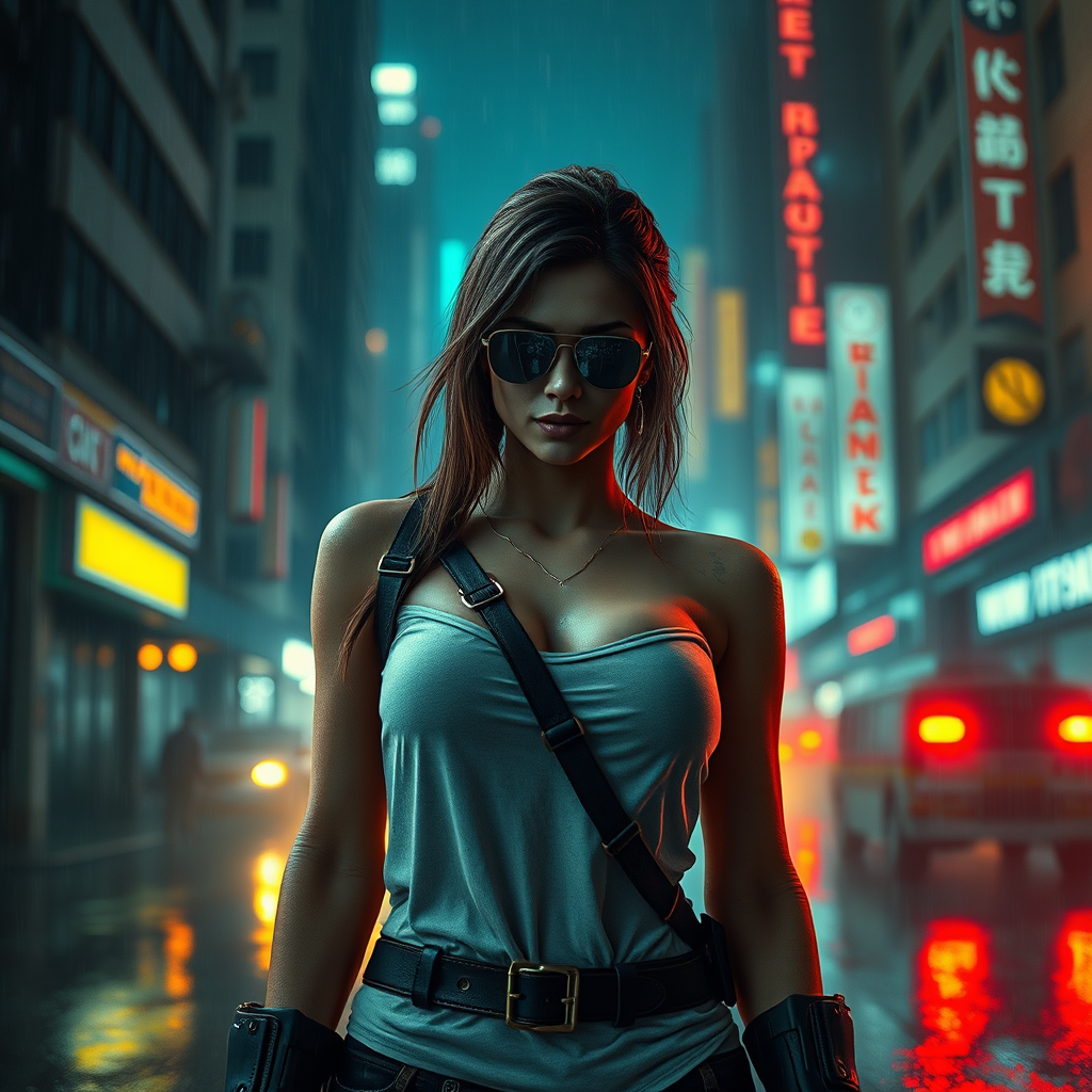 A female bounty hunter stands confidently in the midst of a dystopian cityscape, her full body framed by the rain-soaked environment. Her reflective eyes catch the ambient glow of a neon-lit world, while volumetric fog and global illumination create a moody atmosphere around her. The background is immersive, with atmospheric and dramatic lighting enhancing the high contrast scene. The image captures a raw, high-detail moment, akin to an ultra-high-resolution, hyperrealistic photograph taken with an f1.6 lens. Rich colors reminiscent of cinestill 800 film enhance the realism, while maintaining a sense of cinematic intrigue. This visual captures the essence of a gritty, future world through a blend of realism and artistic creativity, showcasing a sophisticated blend of digital art and photography.