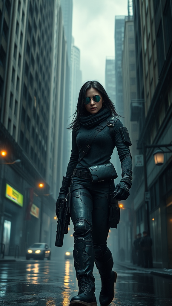 A female bounty hunter with full-body attire, reflective eyes, and a determined expression stands out in the midst of a dystopian cityscape shrouded in a persistent rain. Volumetric fog dances around the towering skyscrapers, with global illumination casting an eerie glow on the wet streets. Atmospheric lighting, rich in contrast, highlights the bounty hunter's movements as she navigates the dimly lit alleys with ease. Her figure is a testament to a life spent in the field, rugged and resilient, with a high-contrast, photo-realistic aesthetic that blends seamlessly into the grim environment. Her attire, designed for stealth and function, is a blend of dark colors and reflective materials that seem to shimmer under the flickering streetlights. Behind her, the cityscape is a kaleidoscope of gritty, gritty textures and muted colors, a synthetically crafted backdrop of atmospheric lighting that brings out the details of her high-tech gadgetry. Shadows and glowing highlights come together to create a sense of depth and realism, as does the abundant use of primary colors - red, blue, and green - strategically placed across the scene to draw out specific features, like reflective objects in the background or the faint glow of streetlamps. Her reflective eyes, ever vigilant, scan the streets with an air of wariness, her gaze crawling over every detail with the thoroughness of someone who's made a career out of it. This is a hunter seasoned by the very streets she now prowls, her sharp instincts heightened in the service of a profession that demands both caution and quick reflexes. High-contrast lighting and atmospheric conditions typical of a dystopian setting add to the narrative, painting the scene with a palette of greys—greys that are both parallel and discordant. These shades of grey so subtly evoke a realization of what once was and what now stands. Her shoes crunch against wet pavement, and water cascades down her back, each splash magnified as the distant steady hum of city machinery underscores the relentless rhythm of the rain. Her visage and movements, carved with precision, emphasize her role as a guardian of order in a city consumed by the shadows of rebellion and social unrest. Every element - the lighting, the surroundings, her attire, and even her expression - collectively contribute to an immersive experience, plunging the viewer into her world like the rain pours down around her.