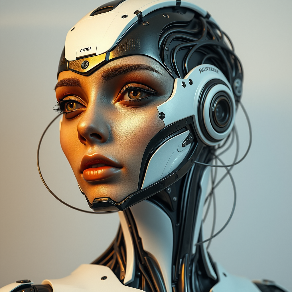 A female character in the style of robotic expressionism, combining dark bronze and matte white tones, with intricate interlacing artifacts. Inspired by Helene Knoop, featuring eye-catching details and layered veneer panels, her form is accentuated by metallic rotation elements, creating a harmonious yet striking appearance.