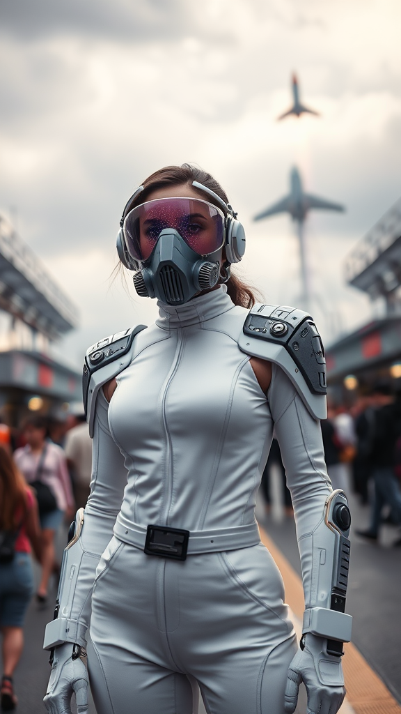A female character stands confidently in a sleek, white jumpsuit, exuding an air of futuristic elegance. The bustling spaceport around her is alive with activity, as a spacecraft lifts off in the distance, its roaring engines barely audible over the chatter of the crowd. The sky is a canvas of overcast grays, the clouds tinged with a faint purple hue that matches the sci-fi visor mask shielding her eyes. This visor is adorned with intricate patterns that glint subtly in the ambient light. Her face is partially obscured by a sophisticated respirator, seamlessly integrated with the plate armor that covers her shoulders and chest, offering both protection and style. Each piece of armor is isolated and detailed, enhancing her sleek silhouette. The scene is captured from a low, third-person perspective, emphasizing the character’s commanding presence. The environment is rich with texture, as natural light casts soft, realistic shadows that dance across her form. A cinematic blur effect lends depth to the photograph, with a long exposure capturing the subtle movements of the high-tech port in ultra-high definition. The image is flawlessly detailed, a testimony to expert ray tracing and rendering techniques, resulting in a photorealistic moment frozen in time. The composition avoids any imperfections, such as digital artifacts or anatomical errors, focusing instead on the harmonious blend of modern technology and human grace against a vividly cinematic backdrop.