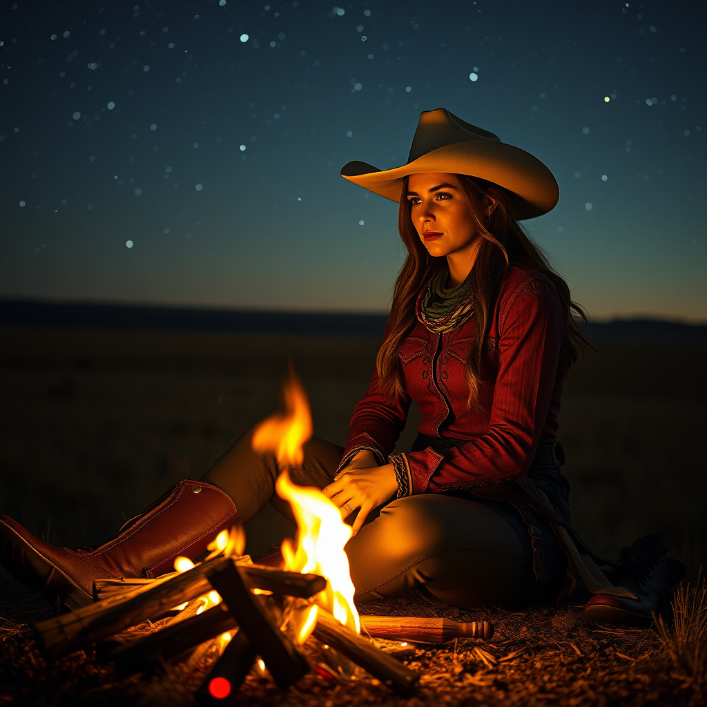 A female cowboy with breathtaking beauty sits by a glowing campfire under the vast prairie sky, embodying the essence of the western frontier. The scene is captured in stunning cinematic quality, with ultra sharp focus on her highly detailed attire and surroundings. She gazes thoughtfully into the flames, a sense of calm and resilience emanating from her. The expansive landscape stretches beyond, merging into the starry night, enriching the visual depth with its tranquil allure. Despite the low resolution atmosphere often tethered to borderlands, the image remains flawless, unmarred by common visual errors like jpeg artifacts, signatures, or watermark distractions. Her anatomy is portrayed with precision, avoiding the pitfalls of extra or missing limbs, ensuring the scene remains disarmingly natural and immersive.