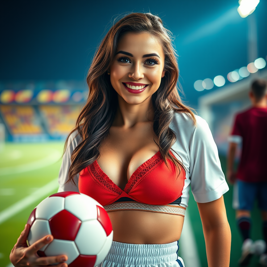 A female dressed as a soccer player stands confidently with a soccer ball by her side, wearing a playful ensemble that combines sports gear with hints of stylish lingerie. She smiles warmly at the viewer, set against the backdrop of a vibrant football pitch. The photography captures her in a portrait style with detailed and realistic skin texture. The image is expertly shot in 8k resolution, emphasizing high detail with a full-length frame. The scene is illuminated with diffused soft lighting creating a shallow depth of field, ensuring a sharp focus on her expressive eyes and captivating smile. The cinematic lighting enhances the hyperrealistic quality of the photo. Caution is taken to avoid low-resolution issues, imperfections, or any distortion, ensuring a flawless and aesthetic presentation.