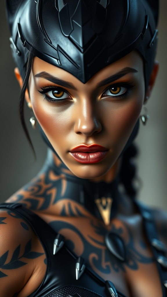 A female dressed as Black Panther with intricate tattoos, gazing confidently at the viewer in a portrait-style photograph. The image captures highly detailed, realistic skin textures in 8k resolution, showcasing hyperrealistic and full-length frame artistry. The lighting is cinematic, with diffused soft lighting and a shallow depth of field, ensuring sharp focus on her features. The composition maintains a high-detail, RAW color aesthetic with an emphasis on skin imperfections like spots and blemishes for authenticity. Her expression is intense, highlighted by piercing eyes, while the blend of cartoon and anime influences subtly enhances the overall artistic style. The character is portrayed as athletic and strong, with muscular definition, dark eyes, and an empowered stance.
