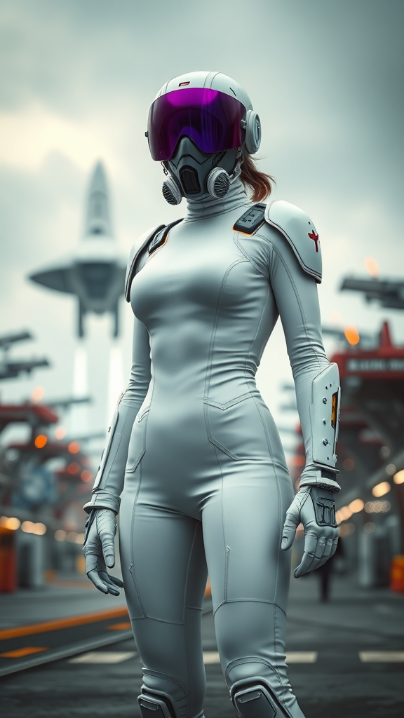 A female figure clad in a form-fitting white jumpsuit stands at a bustling spaceport, a majestic spaceship launching into the overcast sky behind her. She wears a purple visor mask with a futuristic design that shields her eyes, adding an element of mystery. Her ensemble is enhanced with sleek sci-fi armor plates and a sophisticated respirator, contributing to her enigmatic aura. Seen from a third-person viewpoint slightly from below, the scene emphasizes her commanding presence. The meticulous detailing of her attire contrasts sharply with the natural textures of the environment, all captured in cinematic style. The play of natural and moody lighting enhances the photo-realistic quality of the image, while subtle motion blur suggests the dynamic energy of the scene. Ultra-HD 8K rendering and cinematic lighting techniques like ray tracing lend the image an unparalleled sense of realism and depth, evoking the atmosphere of a high-budget sci-fi film. The character's striking pose amid the futuristic backdrop, combined with the meticulous detail of digital rendering in octane, completes this immersive depiction of a sci-fi universe.