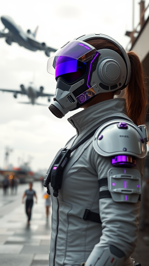 A female figure in a sleek, white jumpsuit stands in the bustling atmosphere of a spaceport, where a massive ship is taking off in the cloudy, overcast sky. The woman wears a shimmering purple visor mask with advanced sci-fi technology, including intricate lenses and a compact respirator, complementing her streamlined plate armor. This armor appears both protective and stylish, emphasizing isolated sections that reflect light dramatically. The scene is captured from a low-angle, third-person perspective, emphasizing the contrast between the detailed jumpsuit and the expansive spaceport environment. The entire composition benefits from photorealistic CGI, utilizing cinematic rendering techniques like ray tracing to achieve ultra-HD 8K resolution. Natural textures and lighting create a moody ambiance, enhanced by blur effects and long exposure, giving the image a dynamic, cinematic quality. The setting feels alive and teeming with futuristic energy, despite slight imperfections like blurriness and asymmetrical detailing, which contribute to its unique, immersive appeal.
