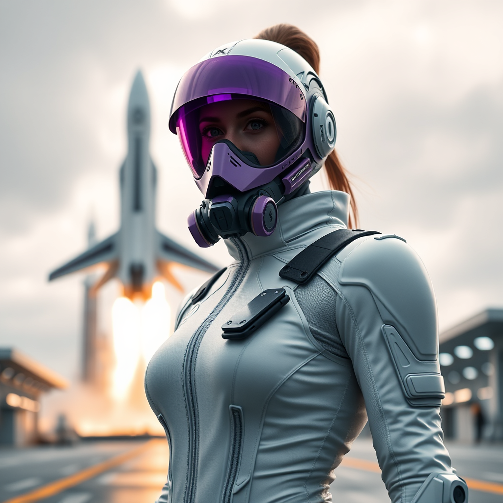 A female figure stands confidently in a sleek, form-fitting, white jumpsuit at a bustling spaceport. Behind her, a futuristic spacecraft lifts off against an overcast sky. She wears a striking purple visor mask complete with a high-tech sci-fi lens and respirator. Her outfit is a blend of advanced plate armor and sleek, isolated armor pieces. The scene captures a third-person perspective from a low angle, highlighting the intricate details and textures of her attire. The composition follows a sci-fi movie style, with a focus on photorealism and cinematic rendering. Natural textures are enhanced by moody lighting, and the scene exhibits a subtle blur and long exposure effect, achieving an 8K Ultra-HD quality. Rendered in a CGI format, the image employs ray tracing for the highest detail and realism, crafting a cinematic atmosphere reminiscent of a high-budget sci-fi film.