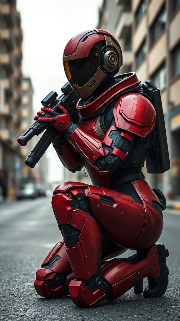 A female figure with crimson cybernetic arms clad in futuristic battle armor, poised on one knee. Her helmet features advanced tech with a sleek design, revealing a bald head partially obscured by a sci-fi visor. In one hand, she grips a futuristic weapon, the other steadying her aim. Her plate armor, comprising intricate panels, delineates the isolated spacesuit. This scene is set on a desolated urban street, under a brooding, overcast atmosphere. The overall composition captures the gritty essence of a sci-fi movie, employing natural textures and realistic lighting that highlights the smallest details. The scene is rendered in photorealistic quality, employing cinematic techniques like ray tracing, with a high-resolution focus, capturing the mood through natural and cinematic lighting. This is seen from a third-person perspective, using blur effects and long exposure to convey motion and intensity, rendered in exquisite 8K Ultra-HD detail.