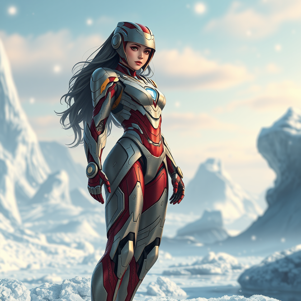 A female hero stands heroically amidst a serene, icy landscape reminiscent of Chill Penguin's stage, her figure both curvaceous and powerful. She is adorned in a sleek, metallic suit, embodying the advanced technology and aesthetic of Iron Man, intertwined with organic elements. Her X suit, infused with repulsor technology, merges seamlessly with intricate armor, a testament to the fusion of elegance and strength. The suit's design showcases ultra-fine details, with lighting that masterfully enhances the bold, vibrant colors reminiscent of Tony Stark's creations. This breathtaking UHD ultra-quality concept art captures her curves and strength, blending anime's grace with comic book intensity. Visually inspired by renowned artists like Adi Granov and Takeshi Obata, the image combines the sleek design of a futuristic hero with the allure of an anime-inspired figure, standing resolute in a world of ice and serenity.