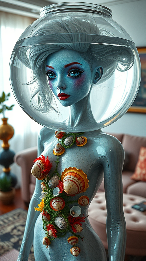 A female humanoid adorned with iridescent scales and dramatically large eyes peers through a transparent fishbowl encasing her head, her hair gracefully drifting within the enclosed water. She stands in a whimsically decorated living room, clad in avant-garde attire crafted from glossy plastics and sleek latex, exuding a futuristic elegance. Her body is entwined with vibrant algae and adorned with delicate mollusks, adding an organic touch to her surreal appearance. Asymmetric techno-inspired ornaments embellish her figure, contrasting with her natural elements. Photographed in cinematic 4k resolution, the scene captures a striking fusion of nature and technology reminiscent of Maya Hansen's bold style, with a focus on intricate details and textures in a square format of 3000x3000.