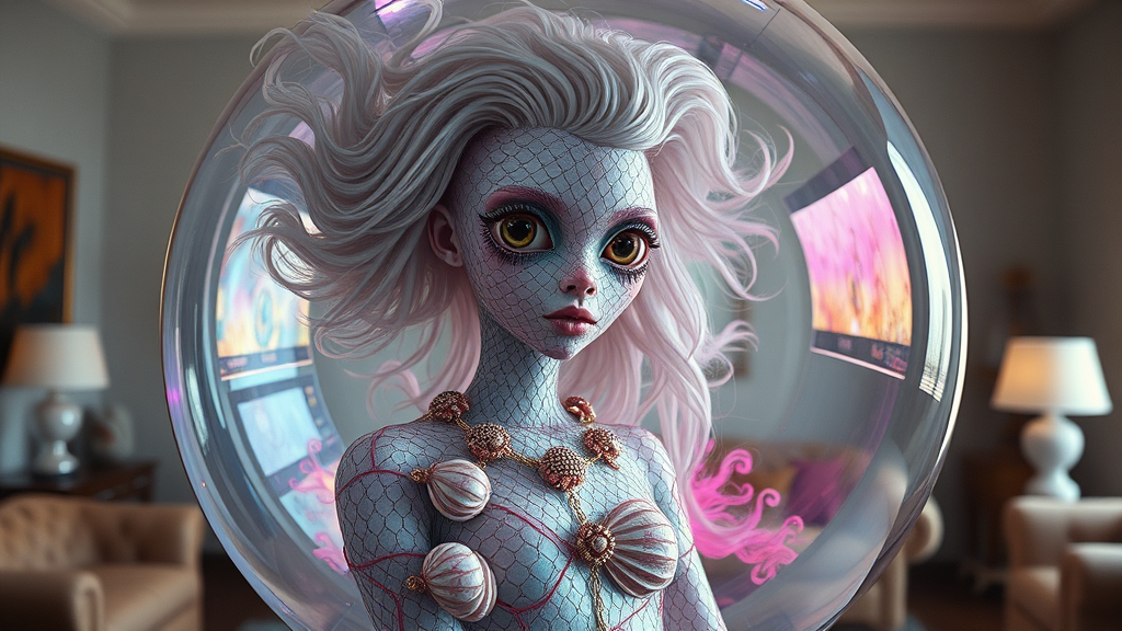 A female humanoid with iridescent scales and colossal eyes peers from within a transparent fishbowl, her tresses floating gracefully around her head. She stands in a surreal living room, her attire an extravagant blend of avant-garde fashion crafted from translucent plastic and glossy latex. Algae drapes over her shoulders and mollusks adorn her limbs, blending seamlessly with asymmetric techno ornaments that pulsate with an inner glow. Captured in cinematic photography, the scene is a high-definition marvel, echoing the visionary style of Maya Hansen in a mesmerizing, futuristic tableau.
