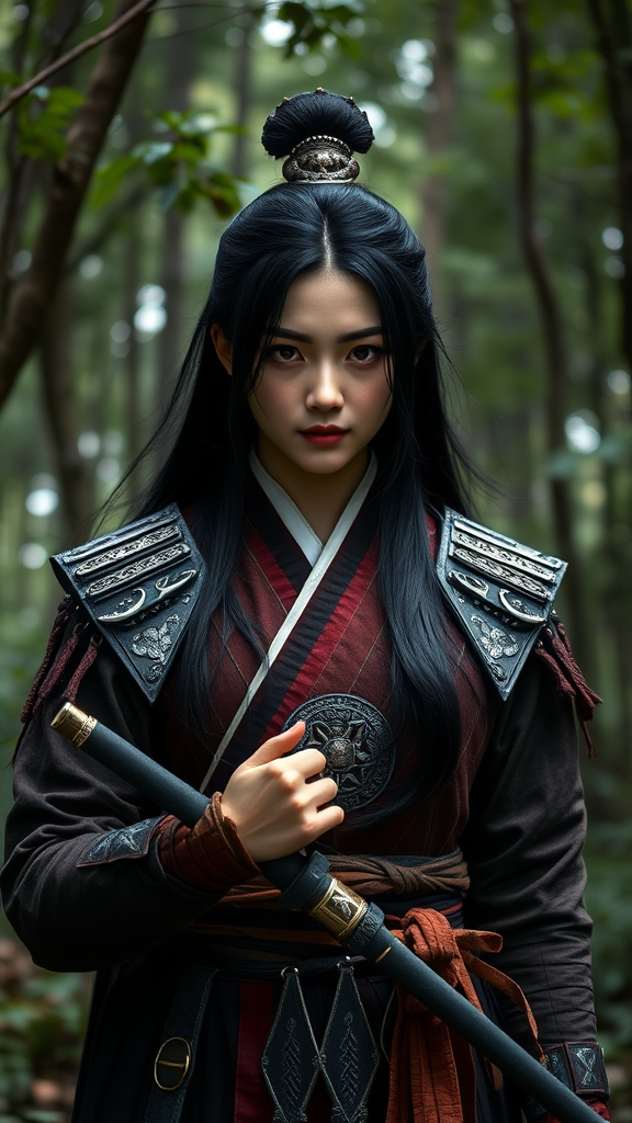 A female hwarang warrior stands confidently in the heart of a dense forest. Her real black hair cascades around her, framing her pale skin and intense brown eyes. Her features are symmetrical and angelic, with a narrow, delicate appearance. Her entire form is proportionate, from her finely shaped face to her balanced limbs and fingers. Clad in full battle gear, she presents a compelling image of strength and grace, with an outfit and weapon that are intricately detailed, showcasing craftsmanship of the finest caliber. The scene is captured with ultra-realistic detail, utilizing high-quality, cinematic photography that highlights every nuance in stunning 8k resolution. Photorealistic, it brings to life the depth and texture of her skin and gear. Bathed in overcast daylight, subtle shadowing adds dimension, while the use of RTX ray tracing lighting and VFX post-production lend an impressive cinematic quality. The waist-length shot focuses meticulously on her, delivering a scene imbued with the drama and intensity typically reserved for movie-quality rendering.
