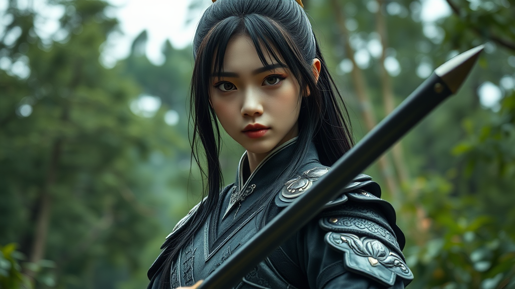 A female hwarang warrior stands in a lush forest, her real black hair cascading over her shoulders. Her pale skin and brown eyes are accentuated by her symmetrical, angelic features. Her narrow and finely proportioned face and body give her an ethereal presence, with well-balanced limbs and fingers. She is clad in full battle gear, each piece exquisitely detailed, intricately designed, and showcasing an ultra-realistic quality. Her outfit and weapon gleam with cinematic detail, capturing the essence of an ancient warrior through a lens of modern photographic realism. The scene is set in daylight under an overcast sky, enhancing the mood with reflection mapping and photorealistic nuances. The warrior is captured in a waist-length shot, exuding focus and intensity. Real shadows play across her skin, which is rendered with real texture and depth. Enhanced by VFX post-production and RTX ray tracing lighting, the image is presented in cinematic quality with 8k resolution, embodying the highest detail quality possible.