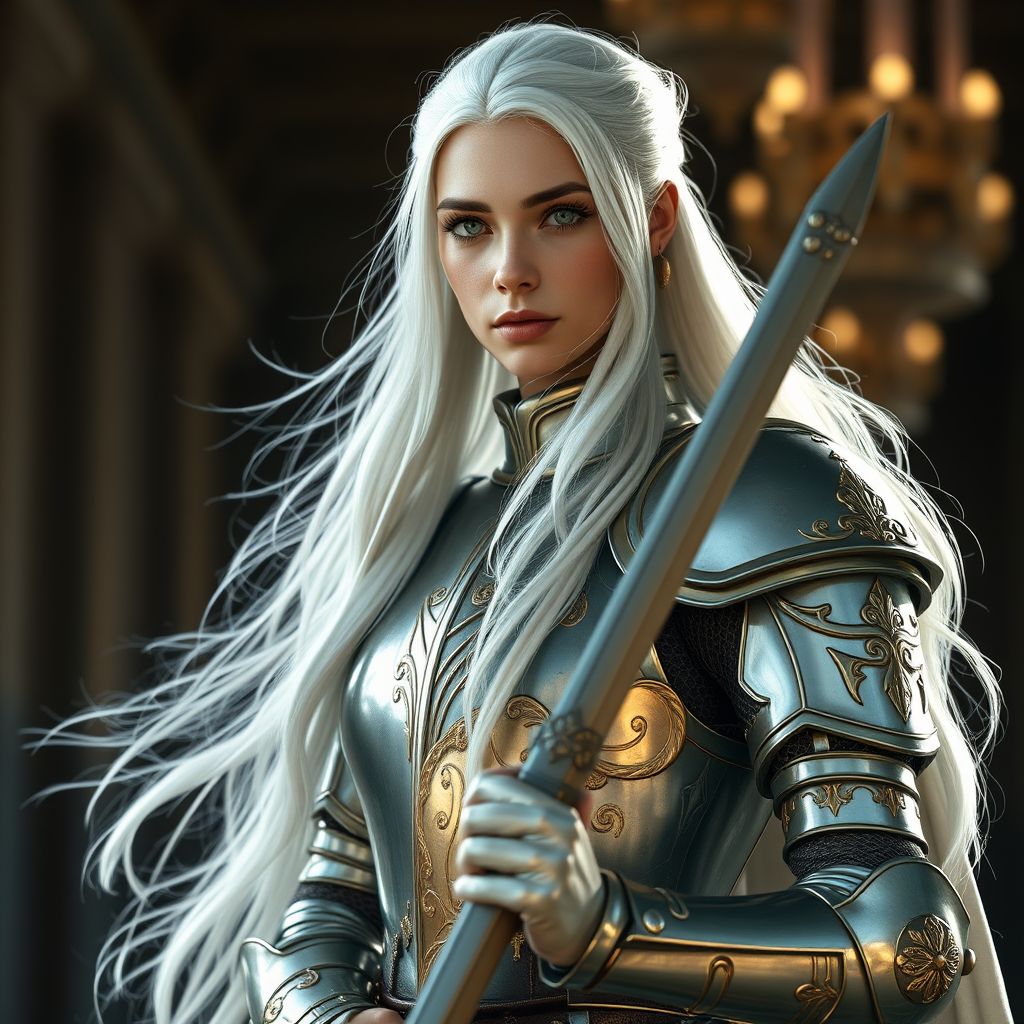 A female knight with flowing long white hair and radiant pale skin stands regally, her mesmerizing green eyes set in a face of symmetrical, narrow, and angelic features. Her physique is slender and graceful, complemented by finely crafted light silver armor adorned with intricate gold embellishments. The armor exhibits the highest quality craftsmanship with ultra-detailed designs, every element capturing attention with meticulous precision. In her hand, she holds a long, expertly forged sword, its presence commanding respect. This full-body, photorealistic scene is captured with cinematic drama, featuring photography lighting and advanced reflection mapping. The setting utilizes depth of field and dramatic light to enhance realism, with genuine shadows and soft illumination adding layers to the composition. Movie-quality rendering and VFX post-production techniques contribute to an ultra-realistic portrayal, while RTX tracing lighting brings out the subtle textures and details of the scene, offering a breathtaking 8K vision of this formidable yet ethereal warrior.