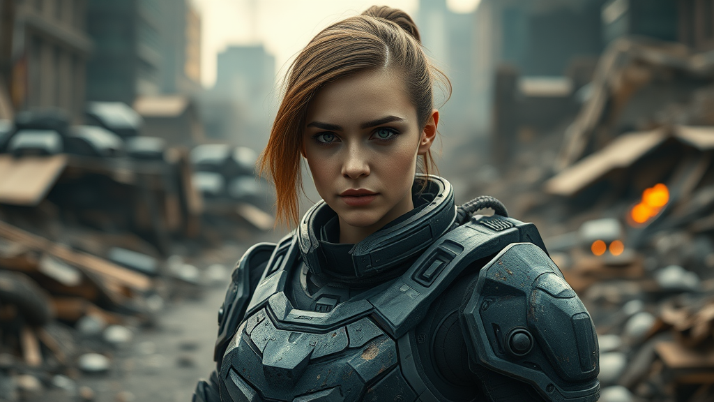 A female marine in futuristic combat armor stands amidst the apocalyptic war-torn background, gazing directly at the viewer. Her armor shows signs of battle damage, yet she stands resilient. The scene is captured with incredible attention to detail, featuring realistic skin textures and highly detailed, photo-realistic quality in 8k resolution. The shallow depth of field enhances her presence, bringing her into sharp focus while the cinematic CGI lighting adds a dramatic flair. The image maintains a hyper-realistic aesthetic, avoiding any low-quality elements such as jpeg artifacts or poorly drawn features. The setting is powerfully evocative yet free from errors, maintaining perfect proportions and anatomy without any deformities.