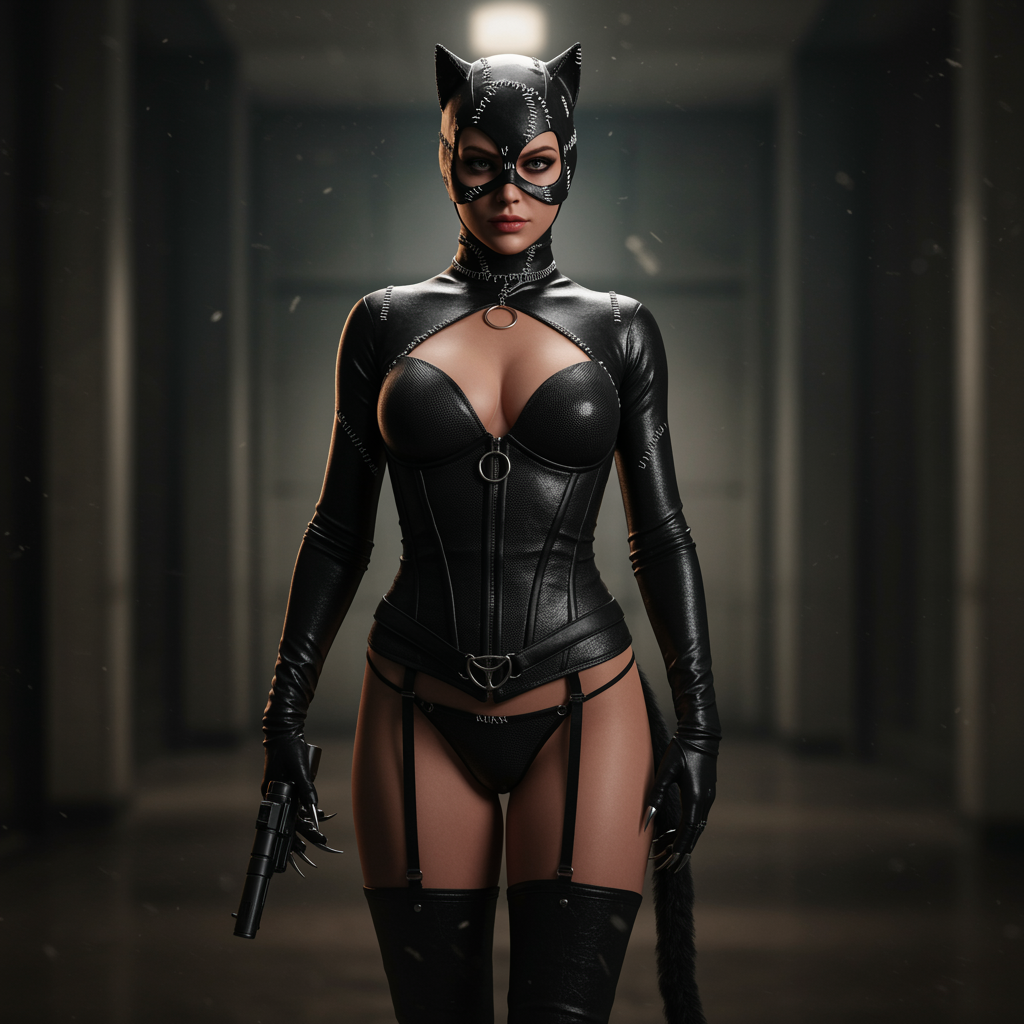 A female model dressed as Catwoman in detailed lingerie with a realistic cat tail, gazes at the viewer. The portrait features a sharp, photo-realistic, and highly detailed depiction, captured in 8k resolution. The image showcases lifelike skin texture, with soft, diffused lighting creating a cinematic and hyperrealistic atmosphere. The scene is captured with a shallow depth of field and sharp focus. Despite the full-length frame, the emphasis remains on aesthetic detail and realism, avoiding artifacts, distortions, and quality issues to present an elegant and striking portrait.