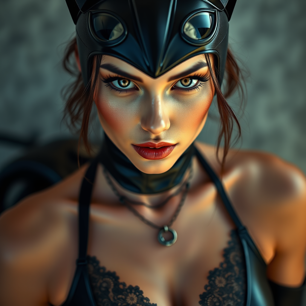 A female model dressed as Catwoman, wearing elegant lingerie and a cat tail, gazes directly at the viewer in a stunning portrait. The photography captures highly detailed and realistic skin in a photo-realistic style, taking advantage of 8k resolution with meticulously rendered details. Portrayed in a full-length frame, the image highlights the high-detail RAW color art. She features a piercing, with diffused soft lighting accentuating a shallow depth of field, ensuring sharp focus throughout. The image embodies hyperrealism, enhanced by cinematic lighting. The composition is free of imperfections such as text, errors, artifacts, cropping issues, and maintains quality without duplication or distortion. It avoids any morbid or mutated elements, ensuring well-drawn anatomy, with balanced proportions and no cloned or malformed features. The image remains free of watermarks and signatures.