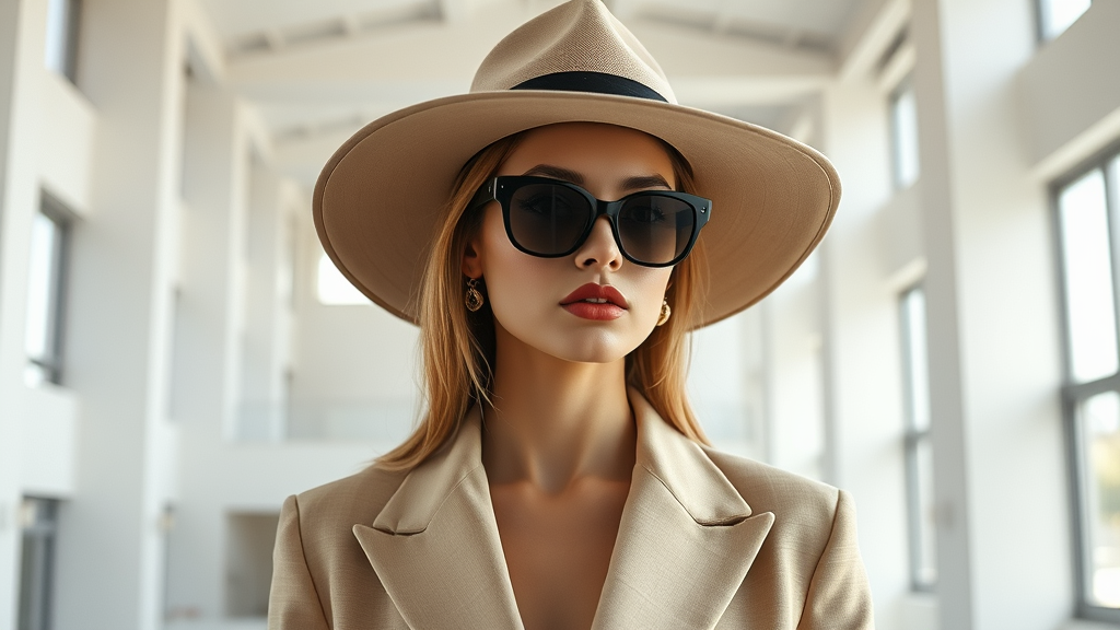 A female model showcases minimalist women's fashion, adorned with an oversized hat and elegant Chanel sunglasses. She is situated within a Bauhaus-inspired building, where bright yet gentle lighting accentuates the scene. The atmosphere exudes minimalist elegance with a sophisticated, high-end allure. The clothing features fine lines and intricate details, highlighting the model's realistic anatomy. Captured with a Nikon D800, the seamless blend of architecture and fashion creates a clean and polished visual narrative.