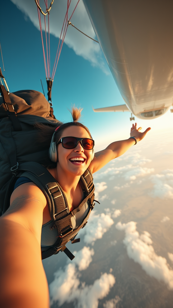 A female parachutist is captured in mid-air as she joyously jumps from a plane, taking a selfie. Her full body is visible with a detailed and photo-realistic depiction of her skin. The image is of 8k quality with highly detailed, vibrant colors and features diffused soft lighting. There is a shallow depth of field with a sharp focus, creating a hyperrealistic and cinematic appearance. The scene excludes any low-quality elements, maintaining a focus on natural proportions without any digital artifacts or distortions.