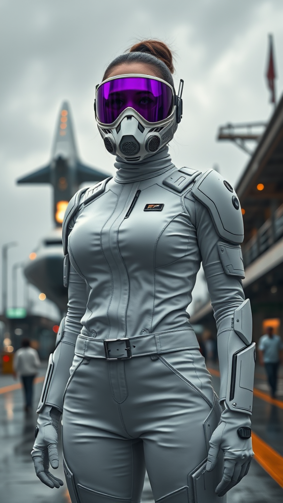 A female protagonist stands confidently in a sleek white jumpsuit at a bustling spaceport, with a futuristic ship launching into the cloudy, overcast sky behind her. Her face is partially obscured by a striking purple visor mask, complemented by a sci-fi respirator and cutting-edge lens. She wears intricate plate armor, featuring segmented isolated pieces that provide a blend of style and protection. The scene is captured from a third-person perspective, looking up to emphasize her presence and authority. The setting is rich with detail, drawing on elements of a sci-fi movie with natural textures and lighting that enhance its photorealism. The atmosphere is cinematic, with moody and cinematic lighting creating a dramatic ambiance. Techniques such as ray tracing and long exposure add depth and realism to the CGI render, with a focus on natural light and texture. The image boasts 8K Ultra-HD quality, deliberately capturing the fusion of advanced technology and human elegance, sidestepping any anatomical inaccuracies to maintain an immersive and richly detailed visual narrative.