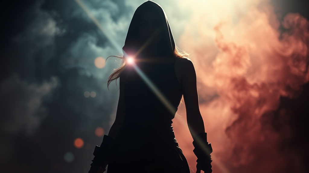 A female shadow assassin stands centered in a swirling dark smoke, surrounded by a mild dark vignette with bokeh lights softly glowing in the background. A lens flare cuts through the scene, enhancing the light bloom effect. Bright backlight casts a cinematic glow, highlighting her silhouette. The scene is captured with depth of field, revealing ultra high-detail with HDR and vibrant high saturation, creating a striking visual. Despite these qualities, there are subtle imperfections like worst quality elements, adding a gritty texture. A watermark overlays the image. The assassin's form is mysterious, with shadows obscuring details, leaving her arms and hands subtly hidden in the darkness.