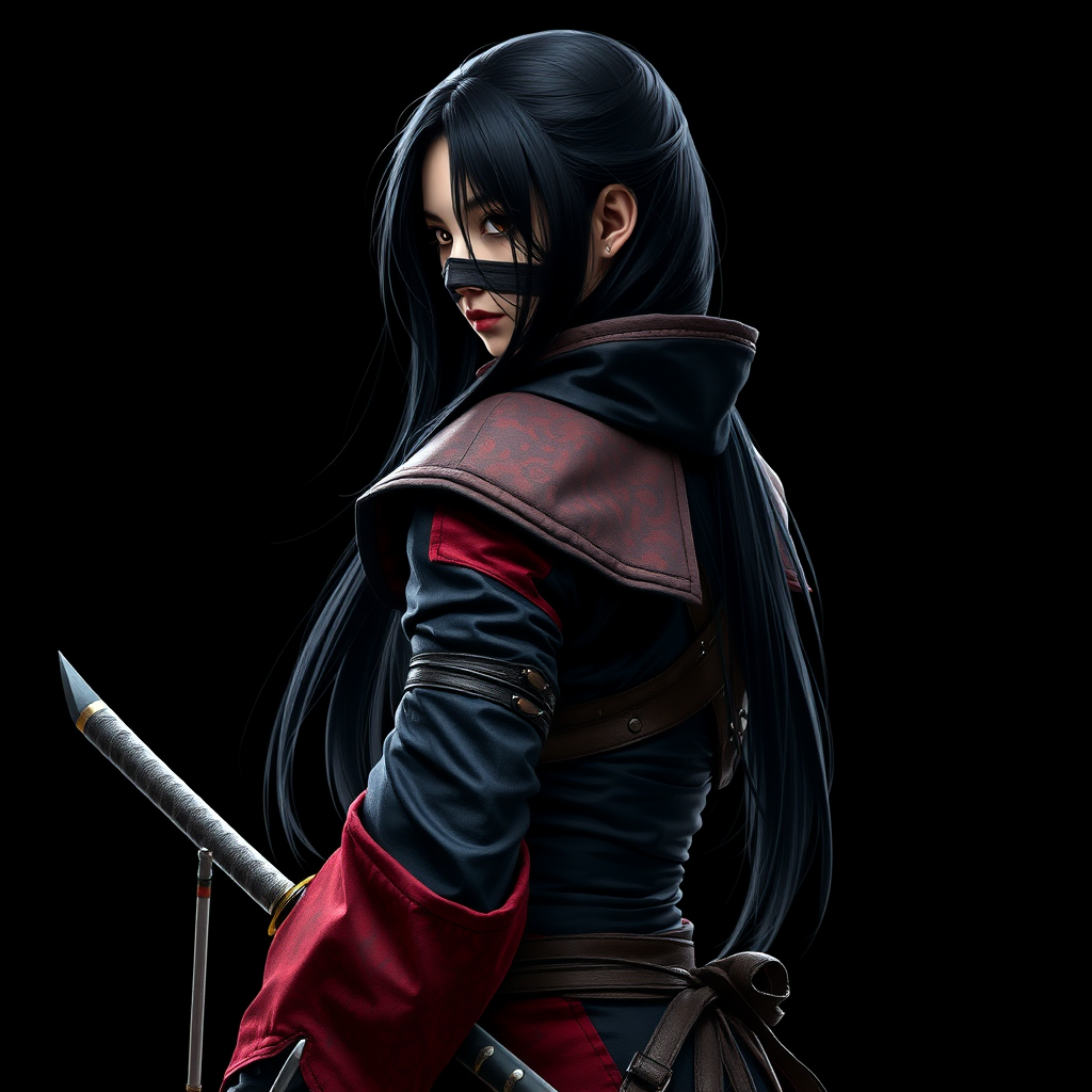 A female shinobi glances over her shoulder in a mysterious pose, depicted from behind. Her long black hair cascades down her back, partially masked. She wields a sharp katana, her silhouette accentuated by a dark padded outfit intertwined with leather and metallic accents. The attire features an intricate blend of black and red, with dark tones and muted colors emphasizing her stealthy nature. The scene conveys a high-contrast, hyperrealistic style set against a black backdrop with minimalist lighting that highlights her presence.