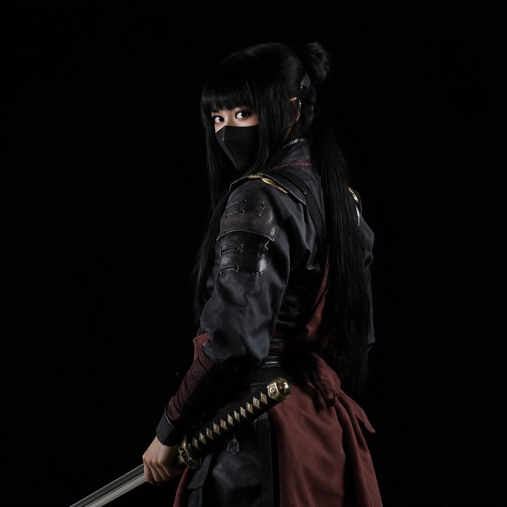 A female shinobi stands turned slightly, glancing back over her shoulder, her mask partially concealing her enigmatic expression. Her long, lustrous black hair cascades down her back, contrasting with the dark padded outfit she's clad in, which boasts leather and metallic embellishments. She holds a katana with poised elegance, its blade glinting subtly in the dim light. Her attire is a blend of black and deep red tones, creating an ensemble rich in dark, muted colors. The scene is captured with high contrast and hyperrealism against a stark black backdrop, with minimal lighting illuminating her figure. Despite the subdued setting, her presence is striking and mysterious, exuding an aura of stealth and strength.