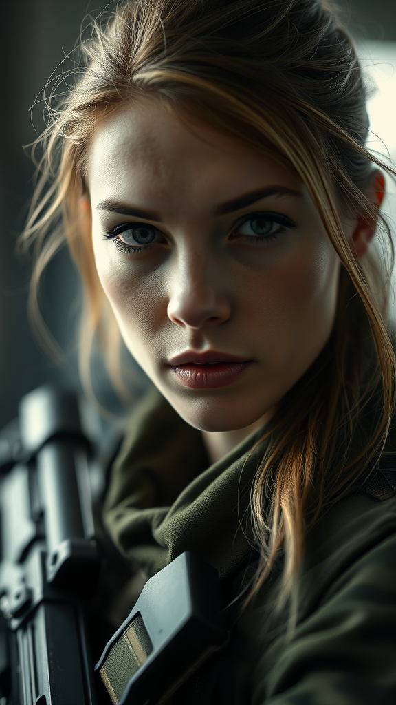 A female soldier looks intently into the camera, embodying the essence of a Private Military Contractor in a scene reminiscent of Call of Duty and Escape from Tarkov. The atmosphere is filled with soft volumetric lighting and a subtle diffuse glow that caresses her features. Captured in a close-up shot, the photograph displays intricate details with a gentle touch. The image is characterized by low contrast and pastel colors, reminiscent of a Kodak Portra 400 film. The composition is rendered in stunning 8k resolution, bringing out the nuanced textures and tones.