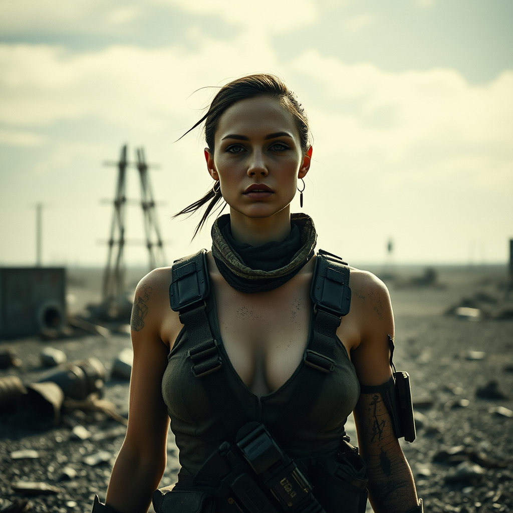 A female soldier stands in a post-apocalyptic landscape, surrounded by the remnants of a dystopian world. The cinematic lighting casts dramatic shadows across her face, adding a gritty texture to the scene. The photo embodies a movie-like quality with intentional cinematic noise. Her figure is slightly distorted, with elements of bad anatomy that defy logic, hinting at missing or extra limbs, as though altered by the harsh environment. Her mutated appearance is unsettling yet fascinating, suggesting a history of survival and adaptation in this grim, unforgiving world.