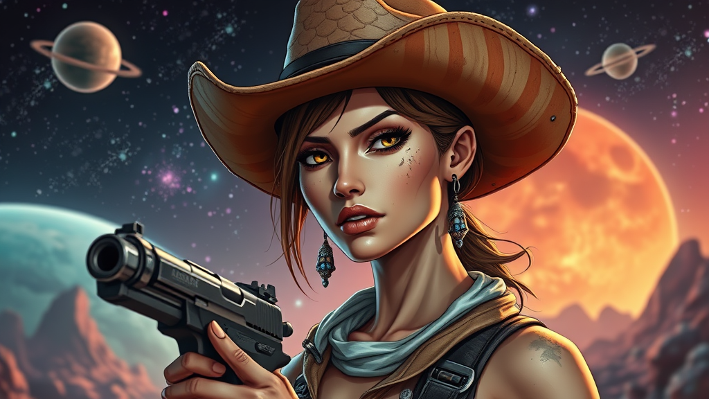 A female space cowboy with a highly detailed complexion, wearing a cowboy hat, set against an alien planet background with cosmic elements, showcasing stunning gradient colors. The style is reminiscent of Borderlands, featuring absurdly high resolution, HDR quality, with an emphasis on cel shading and volumetric atmosphere. Her face shows signs of a rugged, dirty lifestyle, accented by earrings, while holding a futuristic pistol. The scene is enclosed within a trading card frame, highlighting intricate details with no watermark or signature. The background is richly detailed, featuring a galaxy with an aura of mystery, her expression intense and focused. The composition is tight, avoiding any blurry or low-resolution elements. Her long neck and confident posture emphasize her commanding presence in the alien landscape.