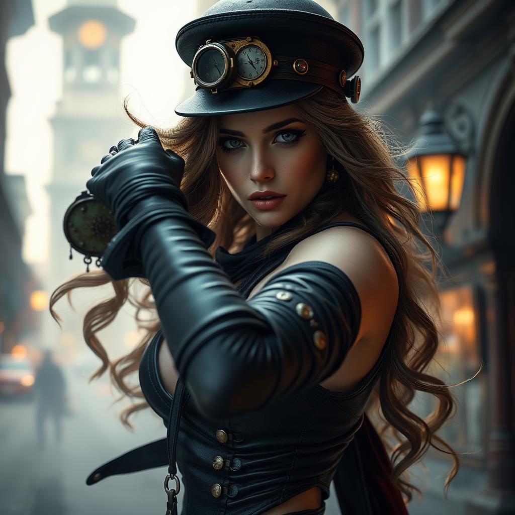 A female steampunk character in a Victorian city, with long wavy hair, captured in exquisite lighting reminiscent of Julie Bell's style, showcasing high detail and 8k quality, in ultra sharp focus amidst volumetric fog, striking a dynamic pose. Avoid issues like low resolution, text, errors, or anatomical anomalies.