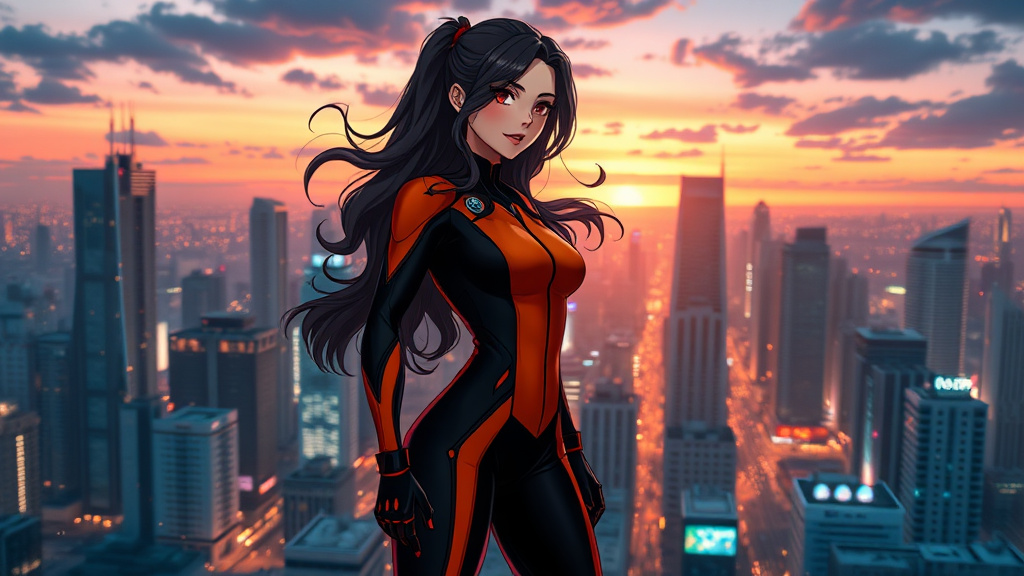 A female superhero stands poised on the rooftop of a bustling cityscape at dusk, her long wavy hair flowing gently behind her. Clad in a sleek black and orange suit, she exudes strength and elegance. The scene is captured in sharp focus and rendered in stunning 8k quality, featuring a dynamic pose that exudes confidence. Volumetric lighting bathes the setting, creating soft shadows that enhance the ambience. The artwork is crafted in a cinematic anime style, blending influences from Studio Trigger, Makoto Shinkai, and Studio Ghibli. The overall composition is vibrant and visually striking, offering a sense of motion and depth in a beautifully animated city. The setting captures the essence of anime aesthetics, ensuring a captivating visual experience without any distractions or imperfections.